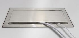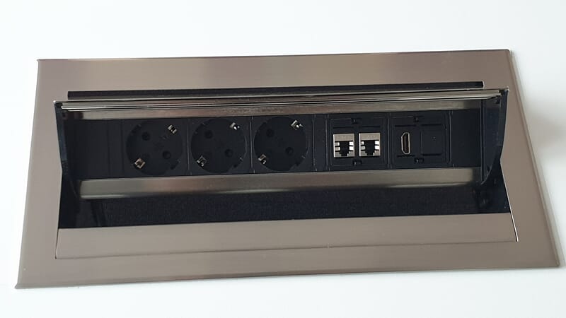 For enkel tilkobling i arbeidsbord og møteromsbord. Lagerført modell er med 3 strøm/2 tele-data og 1 HDMI. Børstet aluminium utførelse.
