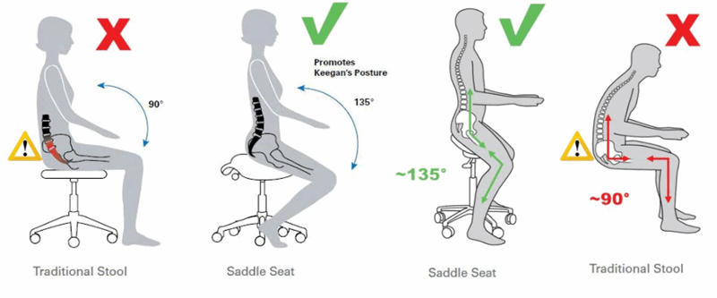 Sittende på TOPergo-stolen inntar en person intuitivt posisjonen som en rytter. Den lar deg få ca 135° helningsvinkel mellom hoften og ryggraden. I denne posisjonen reduseres støttekraften i bekkendelen med 20 %, mens belastningen på korsryggen reduseres.
