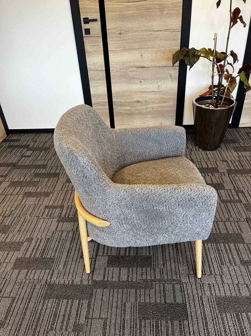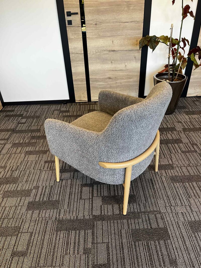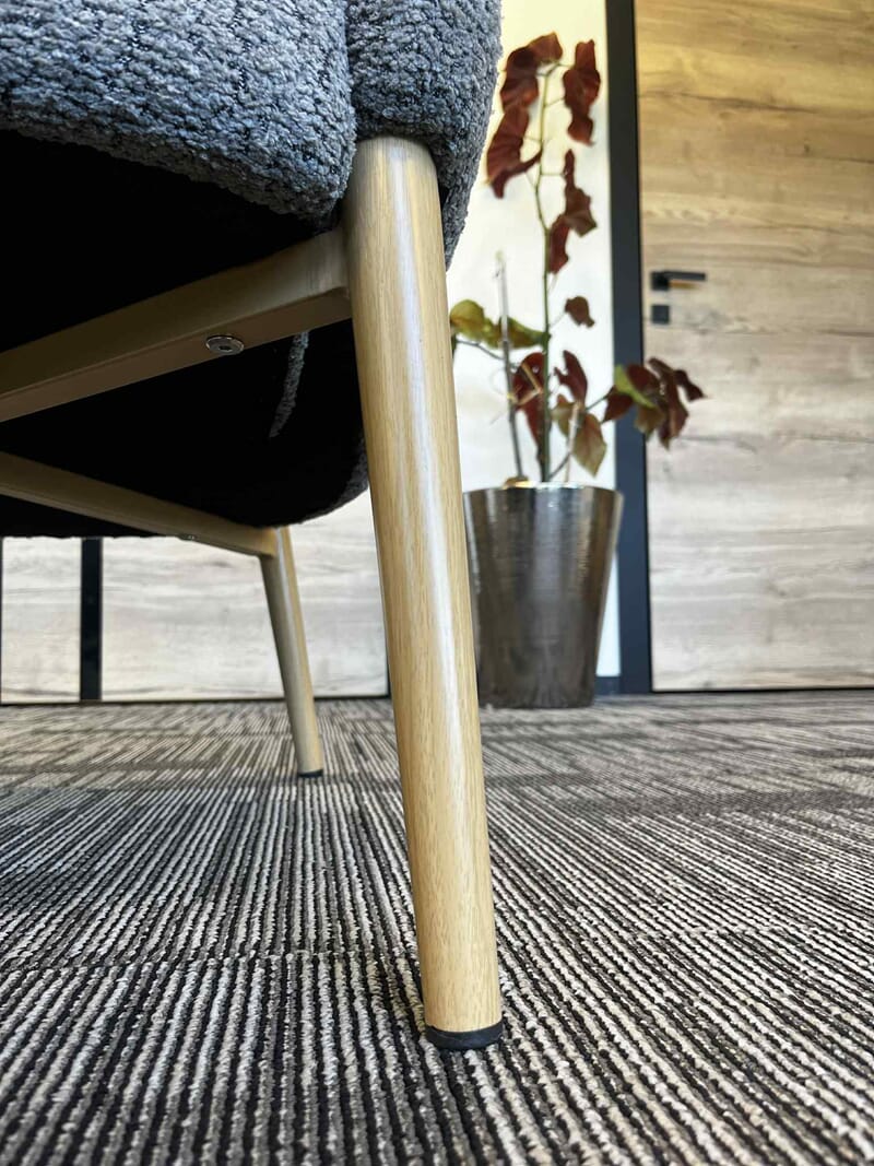 Den avrundede formen og de komfortable armlenene gir god ergonomi og støtte, mens stolens ben med naturtro treutseende gir et lunt og stilrent uttrykk. Til tross for sitt lette og luftige design, er konstruksjonen solid og velegnet for daglig bruk i offentlige miljøer.