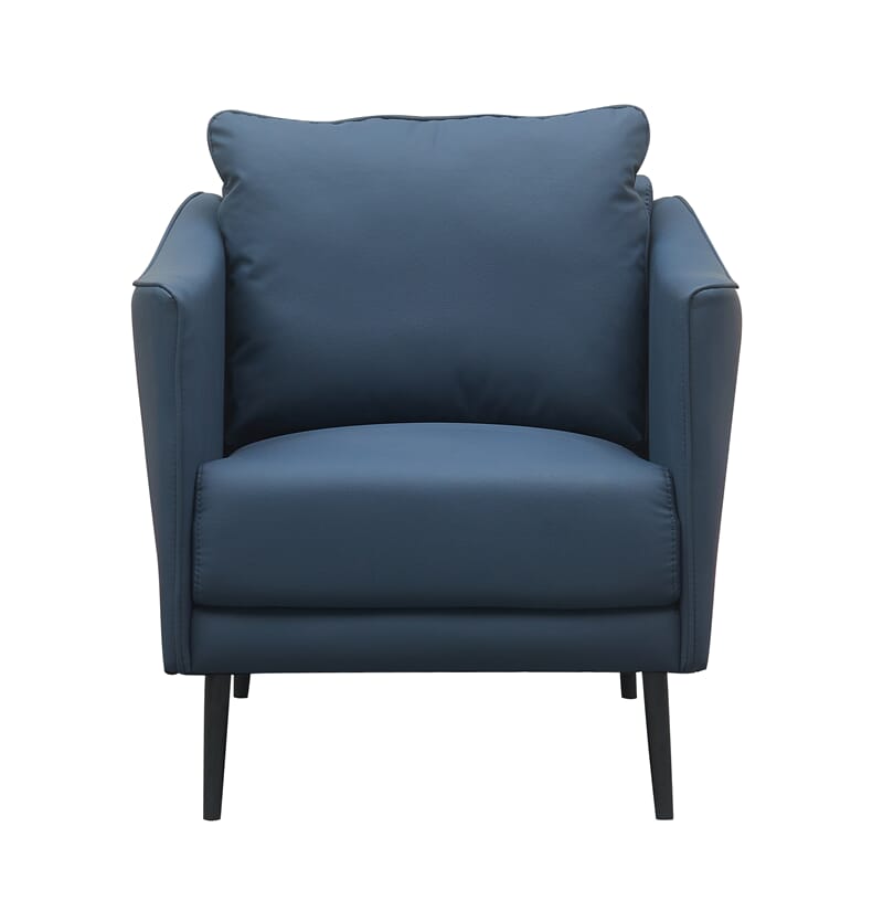 Det dype blå veganske skinnet gir et innbydende og profesjonelt preg, mens de høye metallbena gir stolen et lett og moderne uttrykk – samtidig som det gjør rengjøring enkelt og effektivt.