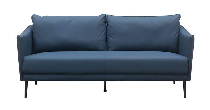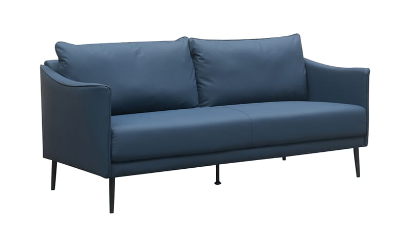 Det dype blå veganske skinnet gir et profesjonelt og innbydende inntrykk, mens de høye metallbena gir sofaen et lett og moderne preg – og gjør det enkelt å holde rent under.