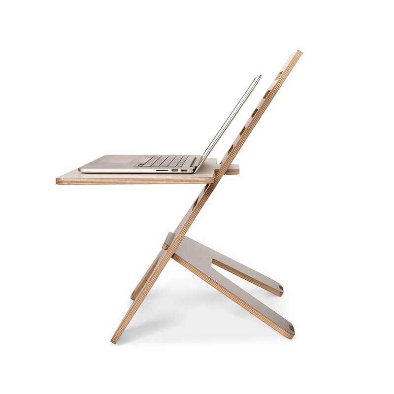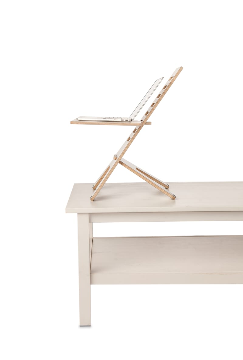 GetUpDesk består av 3 deler i laminert kryssfiner. Bordløsningen monteres og demonteres enkelt uten bruk av verktøy eller festemateriell. Den horisontale platen for plassering av din PC kan stilles inn i åtte forskjellige høyder. GetUpDesk kan derfor enkelt stilles inn til din høyde når den plasseres på et bord med standard høyde eller på lavere eller høyere flater.