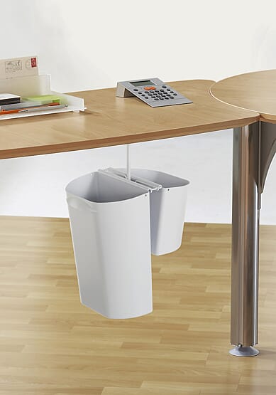 NorLink ToTrib er den perfekte løsningen til enhver arbeidsplass. Denne monteres fritt under bordet og har to forskjellige avfallsbøtter, – én for organisk avfall (5 liter) og én for papir (9 liter). Bøttene kan reguleres trinnløst i høyden og dreies 360° på opphengsbeslaget. Enkel av- og påhekting av bøttene for tømming.